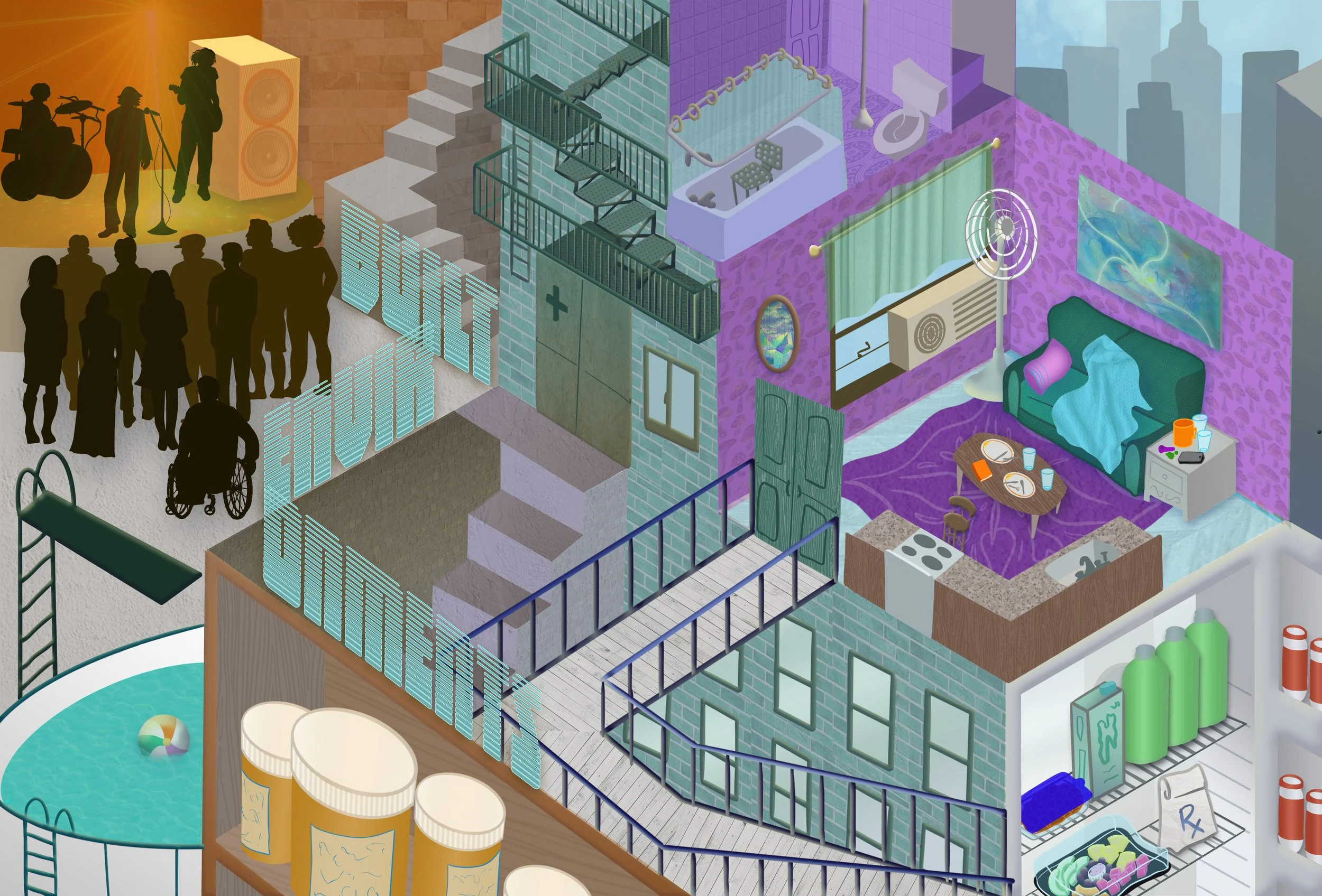 These digital illustrations, created by artist Kirsten Hatfield, were commissioned as title pages for Issue 2, which was themed around ‘Environment’. Both environments highlight the realities, as well as idealised environments for disabled people. The built environment holds more barriers to inclusion, it is more jagged and linear, whereas the natural is more curvaceous. One can see apartments only accessible by stairs, a concert happening without a viewing platform for wheelchair users, and a pool only accessible to those who can climb ladders. The natural environment serves as more of a safe haven in an ongoing pandemic, with open air and a wheelchair-accessible dock. However, humanity’s own environmental impact can be seen through the transparent water holding various debris, the garbage can overflowing with disposable face masks and the bush fire that can be seen in the distance.